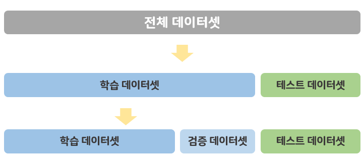 교차 검증이란, 데이터 편중을 막기 위해서 별도의 여러 세트로 구성된 학습 데이터 세트와 검증 데이터 세트에서 학습과 평가를 수행하는 것.